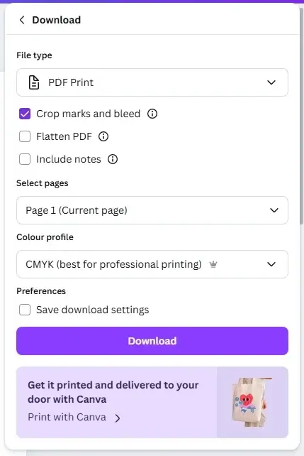 - For CMYK artwork, you can also, under Colour profile, select CMYK (best for professional printing)